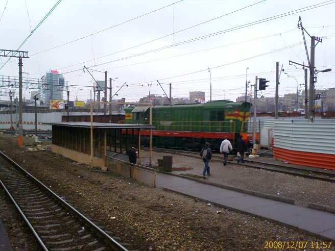 Eine Rangierlok der Reihe ЧМЭ3 rangiert mit einem Wägelchen in der Station Moskau-Savjolovskaja am 07.12.2008. Die Menschen im Gleis sind allerdings in Russland nichts Ungewöhnliches.