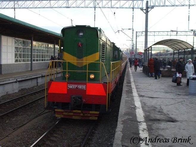 Rangierlok ЧМЭ3Т-5839 ist soeben mit einer Leerzuggarnitur aus Riga im Kursker Bahnhof angekommen.