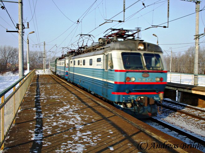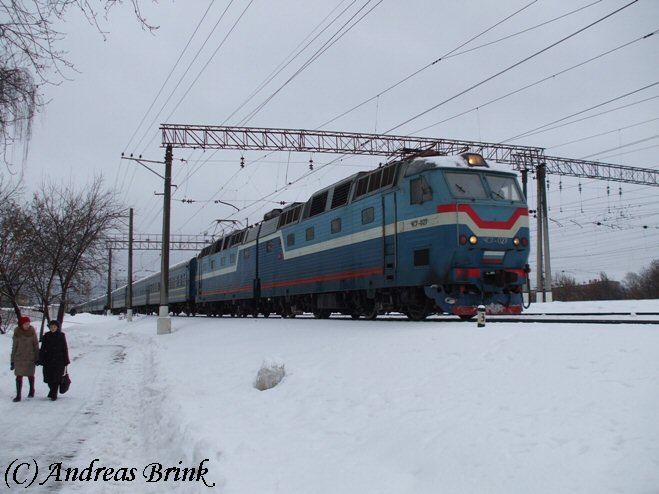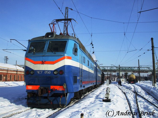 ЧС7 027 durchfährt in gemächlichem Tempo den Bahnhof Pererwa mit ihrem Zug am 15.02.2009.