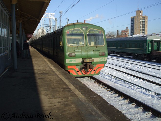 Im Kursker Bahnhof steht die Elektritschka ЭД4M 0034 als Zug 6510 nach Moskau-Kalantschovskaja, die am 03.02.2009 gerade ihrem Ziel zustrebt.