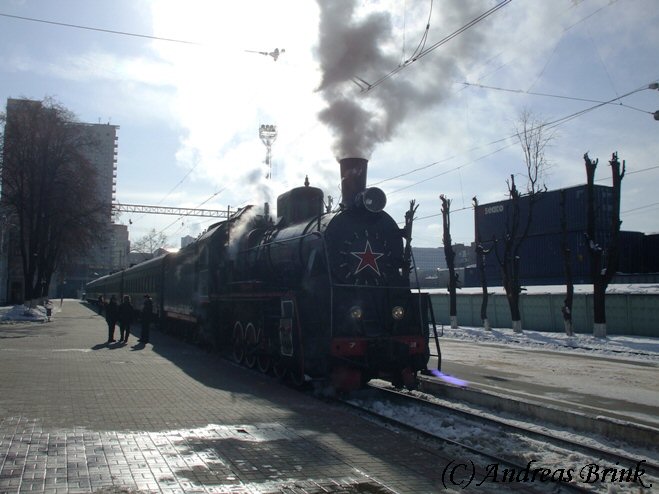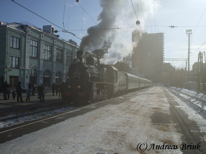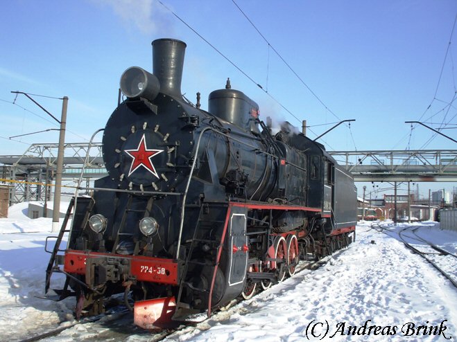 Eine der wenigen betriebsfähigen Dampfloks in Russland ist die Эp 774 38, die bei herrlichem Winterwetter einen Sonderzug mit Gästen des Eisenbahnmuseums ins Depot bringen wird.