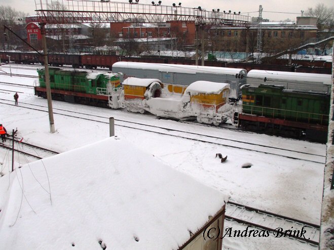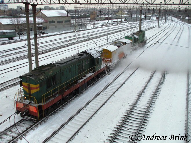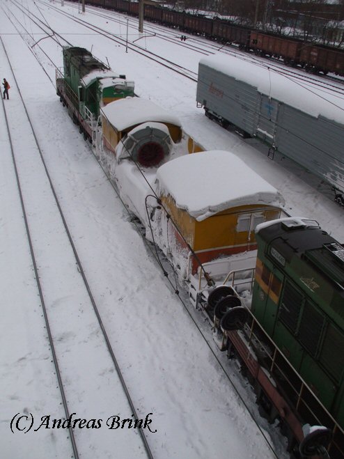 ЧМЭ3 466 und eine weitere ЧМЭ3 räumen gerade das Gleis vom gefallenen Neuschnee mit Druckluft frei, was in Pererwa am 01.01.2009 für eine Schneewolke erzeugte.