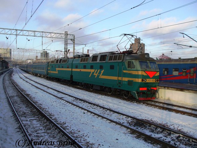 Die ЧС7 153 wartet im Kursker Bahnhof in Moskau auf Abfahrt in Richtung Süden.
