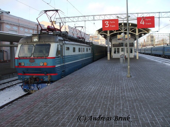 Auf dem Gleis, an dem sonst nur die Elektritschkas fahren, wartet ein Expresszug mit ЧС2К 705 an der Spitze auf Abfahrt.