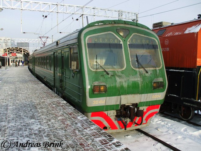 während ЭД4М 0034 am Gleis gegenüber bald nach Tschechov fahren wird.