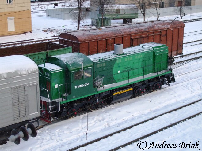 Die Privatlok ТГМ4Б 0358 pausiert gerade im Güterbahnhof Pererwa. Wozu mag wohl der Einkaufswagen dienen?