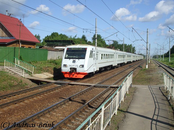 Etwa einen Kilometer weiter in Richtung Moskau ist die Haltestelle Vsljotnaja mit einem Bahnübergang, über den gerade ЭM2 022 fährt...