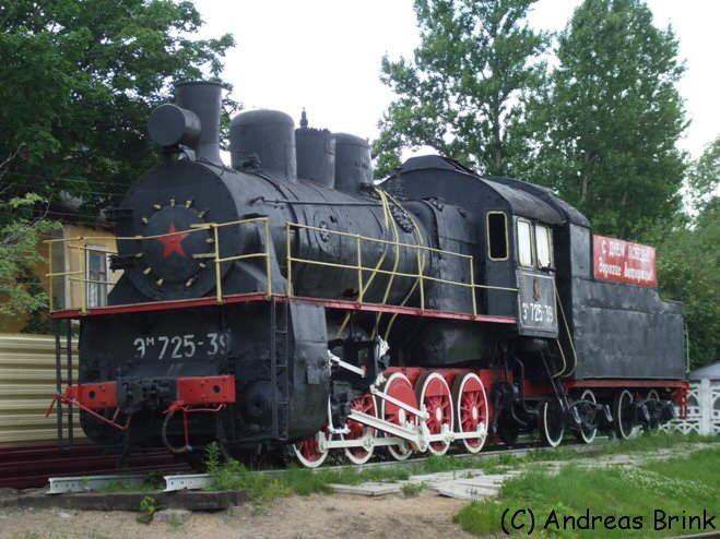 Etwas versteckt steht die Denkmallokomotive ЭМ 725-39 in Tver.