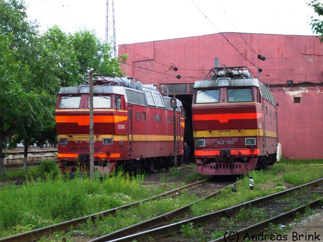 Vor der Werkhalle beim Bahnhof ruhen sich die ЧС2Т-10?6 und 953 aus. Sie sind in der Regel vor Reisezügen zwischen Moskau und St. Petersburg zu finden.