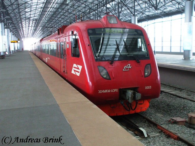 ЭД4М 0091 ist soeben im Moskauer Bahnhof Sovolovskij bereitgestellt worden, um Fahrgäste zum Flughafen Sheremetevo II zu bringen.