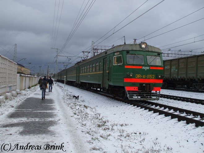 Die Elektritschka ЭР2-К-1152 fährt gerade von der Station Pererwa ab.