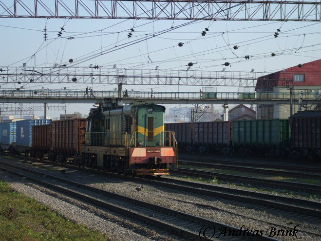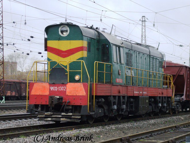 Im Bereich des Verschiebe- und Rangierbahnhofs von Golutwin arbeitet an diesem verregneten Sonntag die ЧМЭ3 1302, ...