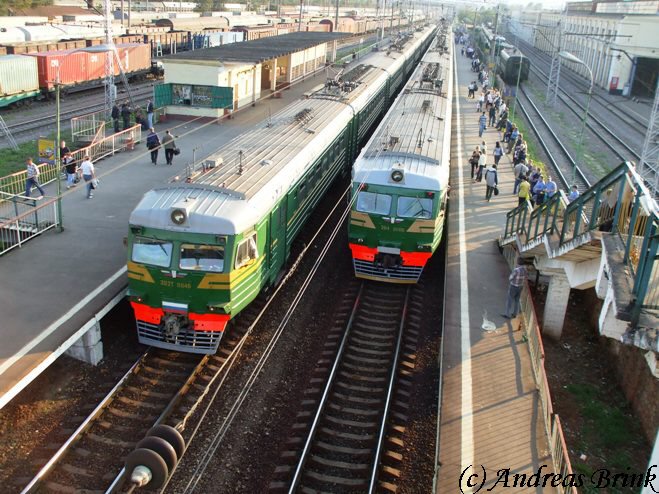 Die ЧС7 221 fährt gerade mit ihrem Zug 75 (Moskau, Kursker Bahnhof - Adler) an, während die Elektritschka ЭД2Т 0033 als Zug-Nummer 6371 von Moskau-Kalantschovskaja nach Tschechov noch etwas warten muss, bis das Gleis frei wird.