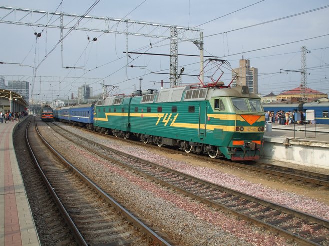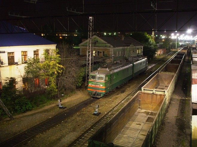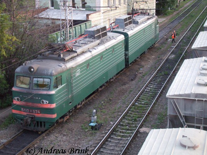 Dies ist nun der Blick von der Fußgängerbrücke in meinem Stadtteil, die gleichzeitig der tägliche Weg zur Universität ist. Zunächst habe ich die ВЛ10 Ч 574, eine Lokomotive der mittleren Art, die aber auch schon Güterzüge von beachtlicher Länge zieht.