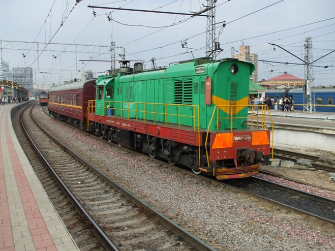 In Deutschland hat die Schnellzuglok 103 sechs Achsen - hier ist es eine Rangierlok mit gleicher Achsanzahl, die im Kursker Bahnhof in Moskau mit einem Waggon herumrangiert.