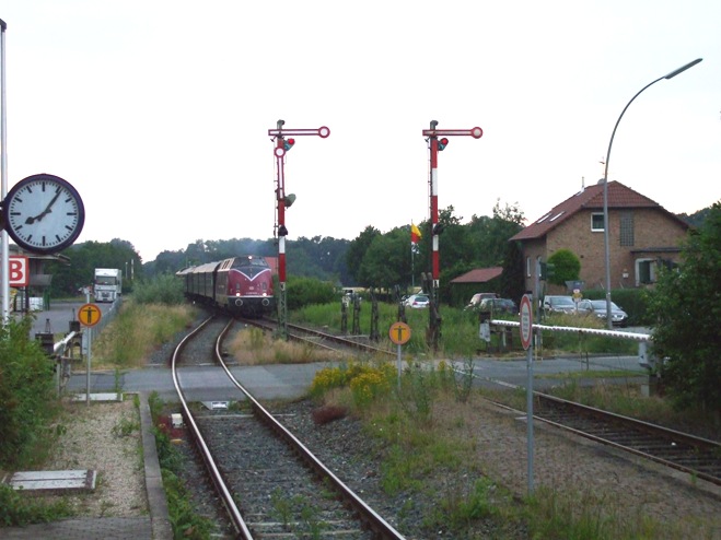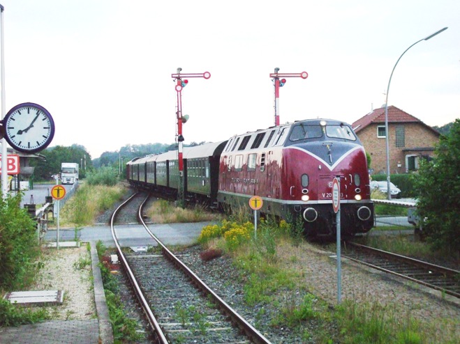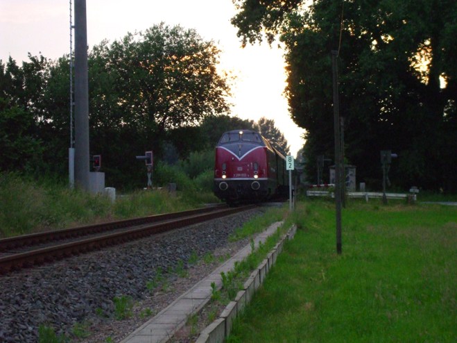 Auf einer Lernentspannungstour mit dem Rad in der Nähe von Münster-Häger begegnete mir zufällig ein Sonderzug bespannt mit der V200 033. Auf der Hinfahrt hatte ich noch versucht, ein Foto zu machen, das aber ein schlechter Notschuss wurde. Also habe ich die Rückfahrt abgewartet!