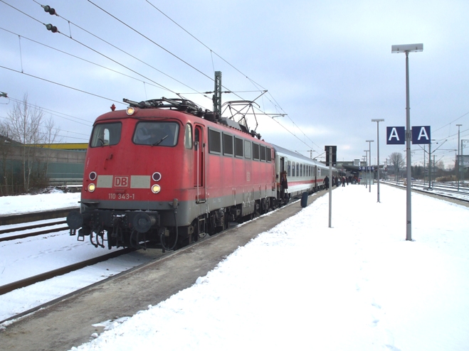 Typisches Winterwetter im Jahr 2010 - wegen des Wetters ergeben sich auch die 101er vertretende Baureihe 110. So bespannte am 12.02.2010 die 110 343-1 den IC 333 (Luxembourg - Norddeich-Mole). Hier steht sie kurz vor der Abfahrt im Hauptbahnhof Emden.