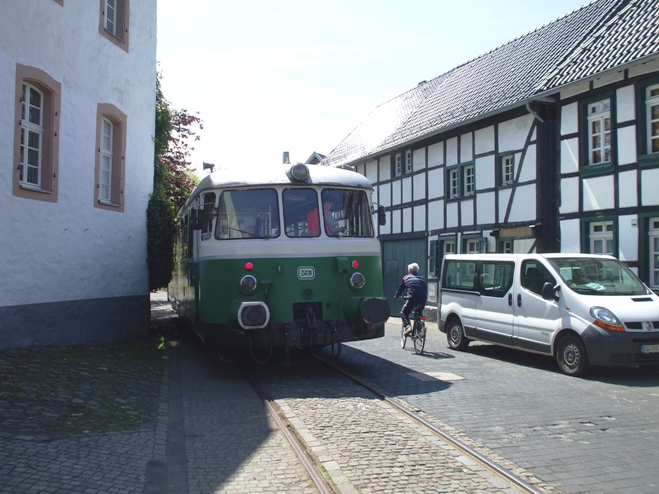 Es wird reichlich eng - aber letztendlich passt alles. Kaum zu glauben, dass hier früher regelmäßig Dampfloks fuhren bzw. bis 2005 von Schleiden aus Militärtransporte (und auch schwere Panzer) durch den Ort gekarrt worden sind.