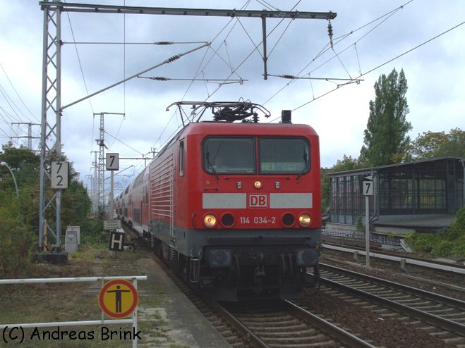 114 034-2 fährt als RE1 von Potsdam Hbf nach Frankfurt Oder und durchquert hier gerade den Bahnhof Berlin-Karlshorst - am 13.09.2009.