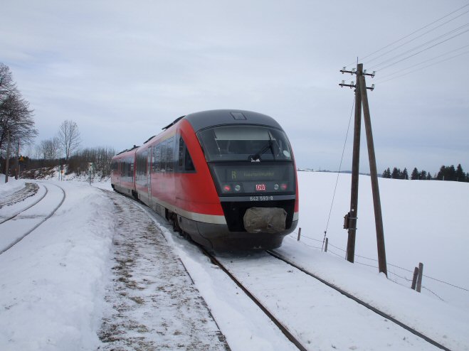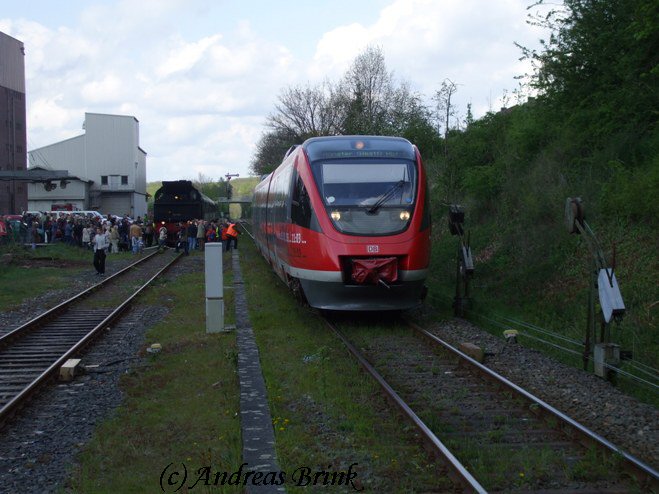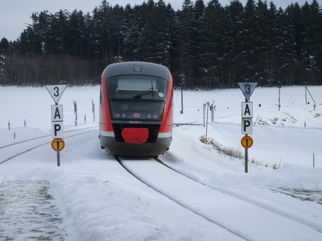 ...und dem Gegenzug in Form von 642 214-0 und einer interessanten Nebenbahn-Beschilderung.