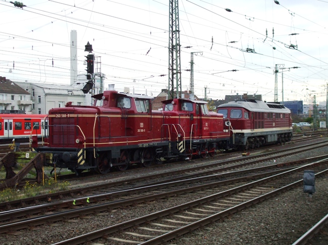 260 588-9, 260-773-7 und 232 088-5 warten im Hauptbahnhof Münster im Zuge der Streckensanierung zwischen Münster und Rheine auf neue Einsätze am 06.11.2009.