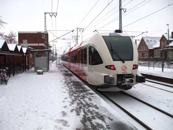 Am 20.12.2009 kommt soeben eine verspätete Arriva-Bahn in den Bahnhof Leer gefahren.