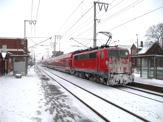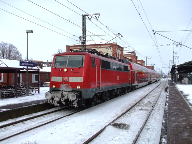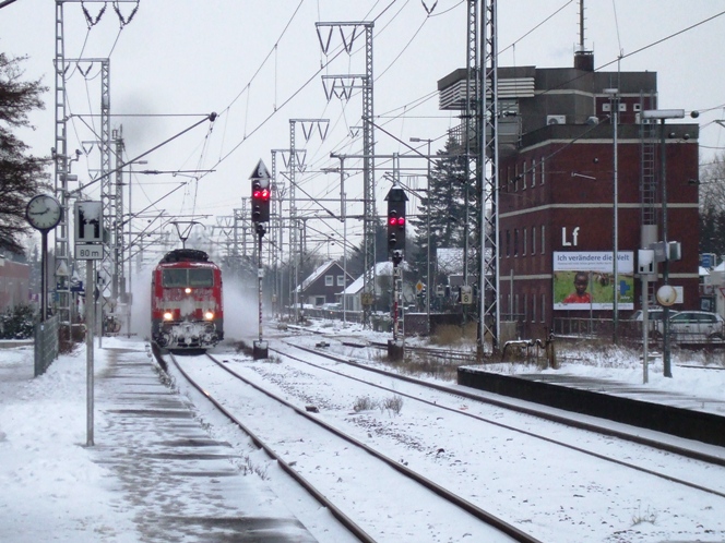 Kurz danach kommt Schwesterlok 111 083-5 mit einem Gegenzug von Emden gefahren und zieht eine dicke Schneewolke hinter sich her!