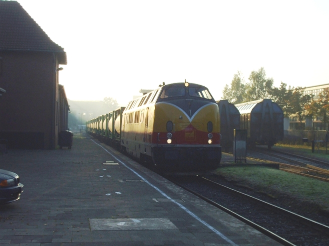 Der morgendliche Güterzug 384 von Pinnow nach Coevorden-Heege, der fast immer aus Lebensmittelcontainern besteht, wird am 21.10.2010 mit zwei Lokomotiven gezogen - an der Spitze mit V22 und dann mit der V5.