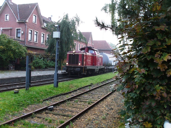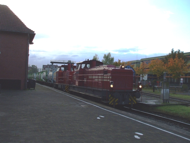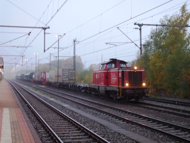 Am 18.10.2010 durchfährt die D20 (ehem. DB V200) den Bahnhof Nordhorn mit dem ansehnlichen Schweinefutter-Containerganzzug 384 von Pinnow nach Coevorden-Heege.