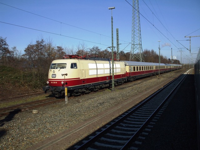 ...denn nur 17 km weiter in Papenburg stand die 103 235-0 mit ihrem TEE abgestellt. Ziel der Fahrgäste war die Meyer-Werft, deren Info-Zentrum immer häufiger von Sonderzügen angefahren wird. Leider gelang auch hier nur wieder der Notschuss aus dem Toilettenfenster.