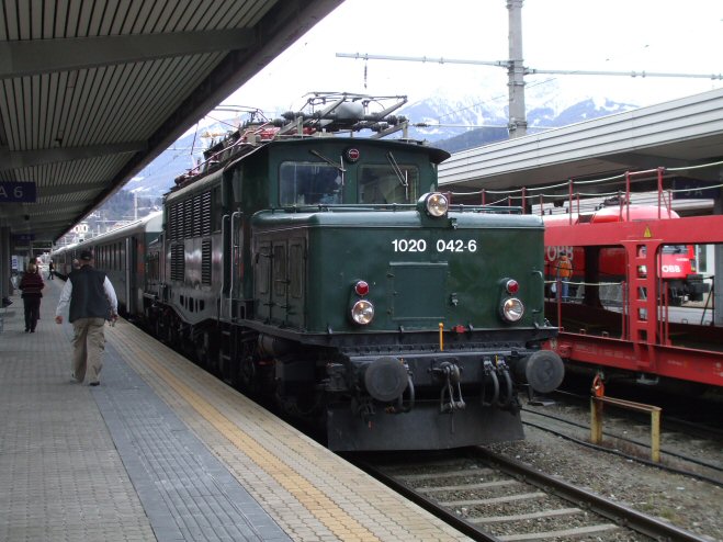 Nicht nur im Zoo: das Krokodil 1020 042-6 vor einem Sonderzug nach Villach in Innsbruck Hbf.