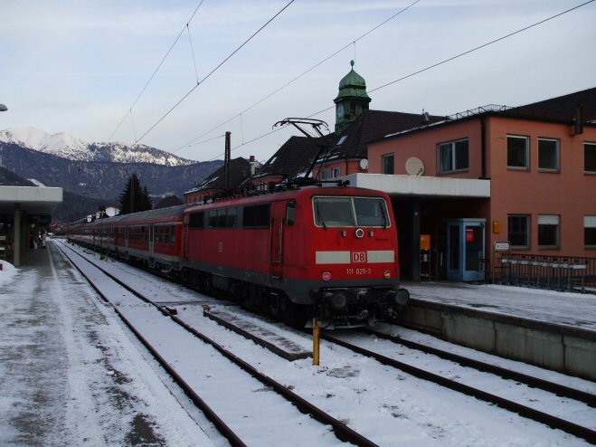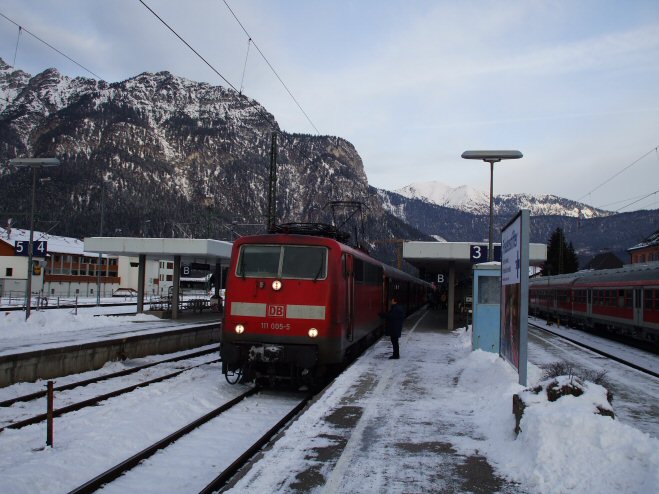 111 005-5 vor RB 30609 (München Hbf - Mittenwald) brachte mich zum Ausgangspunkt der Außerfernstrecke, nach Garmisch-Partenkirchen. Endlich mal den Schnee und (wieder) die Berge genießen!
