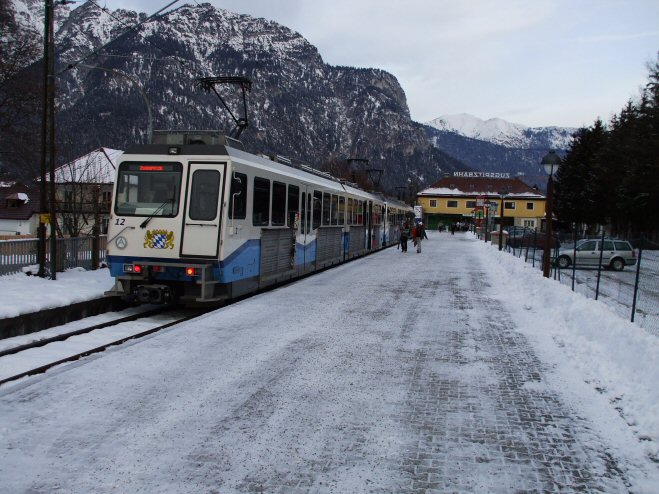 In Garmisch-Partenkirchen steht ein der Triebwagen 22 der Zugspitzbahn zur Fahrt auf eben diesen Berg bereit, um dort Skifahrer hinzubringen.