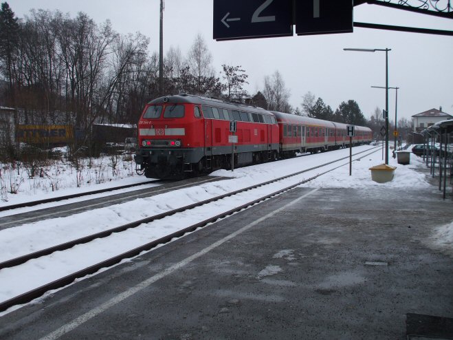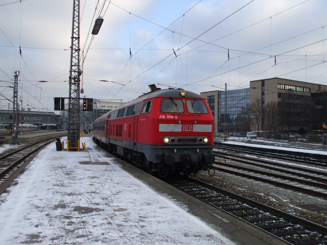 Bei "außerfriesischer" Kälte bibbert vor Kälte 218 358-0 vor dem RB 27003 von München Hbf nach Simbach (Inn) im Münchener Hbf.