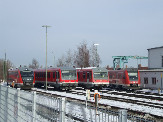 Und im Bw Kempten dann ein Generationentreffen von verschiedenen Triebwagen: 642 077-2, 928 350-8, 628 102-3 und 612 581-9.