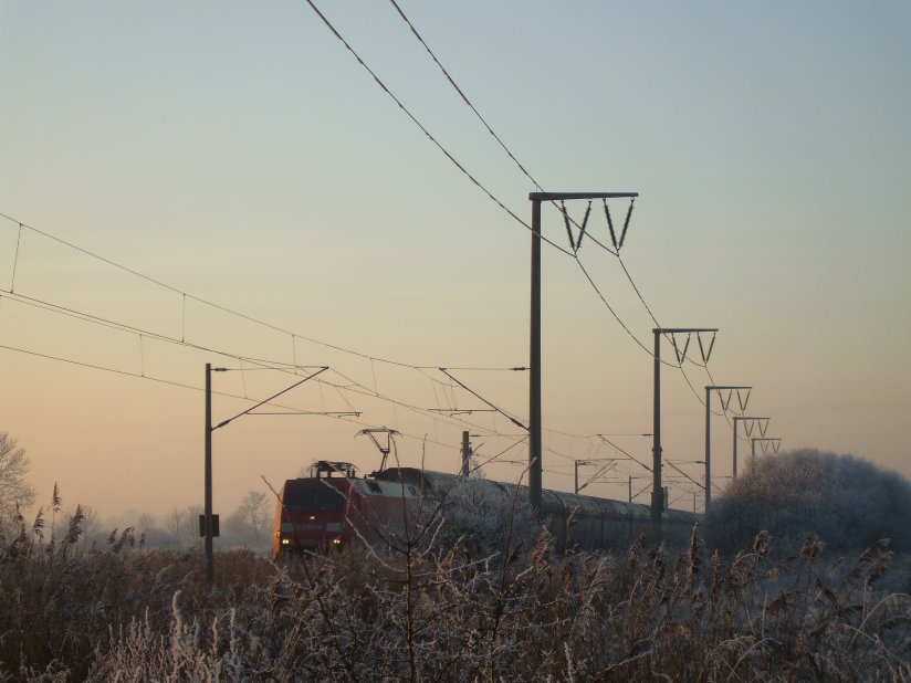 Winter in Ostfriesland: Dicker Raureif lag am 22.12.2007 über Bäumen und Feldern. Durch diese Landschaft eilt eine 101 mit ihrem IC 433 von Luxembourg nach Norddeich Mole.