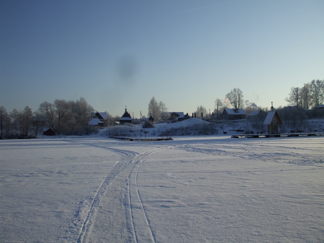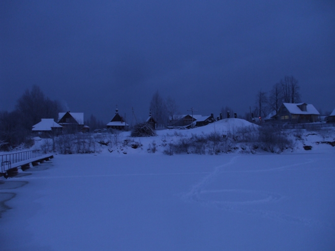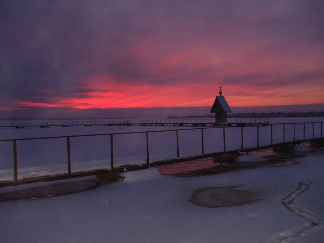Kurz nach der Ankunft sind Masha und ich dann ans Wolgaufer gegangen, um wieder den Sonnenuntergang zu sehen. Es war ein absoluter Wintertraum: Die Wolga war ganz zugefroren, nur am Rand an einigen Stellen war es noch feucht. Auf einem der Stege stand eine neue kleine Ikonenkapelle und gerade ging die Sonne unter, so dass wir wieder den Abend genießen konnten. Fasziniert war ich von den Winterfarben - ein solches Blau hatte ich noch nie gesehen, dass sich über das Dorf nieder senkte und es quasi in das Bett aus Schnee legte.