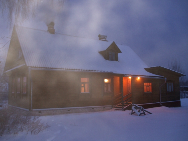 Zurück im Haus wurde es schon langsam wärmer, bei unserer Ankunft waren es nur +5°C, weil ein Freund der Familie das Haus am Tag zuvor vorgeheizt hatte. Zum Essen waren wir bei eben dem Freund und seiner Familie eingeladen - es gab vorzügliche Pilzsuppe und Kartoffeln mit einer total leckeren Pilz-Creme-Soße. Anschließend sind wir wieder zum Haus zurückgegangen und nach einer Weile sind dann die Eltern rübergegangen und wir haben auf das Feuer geachtet. Ich habe noch ein wenig Holz nachgeholt. Später sind wir dann wieder zu den Freunden gegangen - dieses Mal schnurstracks in die Banja (eine russische Sauna). Sie hat einen Ruheraum, einen Saunaraum und einen Waschraum. Wir haben uns umgezogen und dann gleich in die Hitze begeben und fingen auch gleich an zu schwitzen. Nach ein paar Pausen wurde es dann richtig anstrengend und mir fast zuviel, weil es so heiß wurde. Zu allem Überfluss wurde dann noch kellenweise Wasser in den Ofen geschüttet, teilweise mit Pfefferminzduftöl, so dass ein fast schon beißender, aber angenehmer Geruch in der Luft lag. Kurz vor Schluss wurde die Durchblutung noch mit Weidenzweigen angetrieben und damit Luft zugefächert, die allerdings nicht kühlte sondern noch mehr Hitze brachte. Und dann hieß es wie auf Kommando: "Auf in den Schnee!" So sind dann alle Männer nach draußen gerannt und haben sich im Schnee gewälzt. Zugegeben - beim ersten Mal habe ich es mich nicht richtig getraut und mich damit nur eingerieben. Beim zweiten Durchgang habe ich mich aber genauso in den Schnee geworfen - bei -24°C. Nach zwei weiteren Gängen haben wir dann noch eine Kleinigkeit bei der Hausherrin gegessen und sind dann todmüde nach Hause gelaufen, wo dann ein schön aufgewärmtes Haus wartete. Da ich direkt am Ofen im Bett und dazu noch oben, wurde mir so warm, dass ich kaum schlafen konnte.