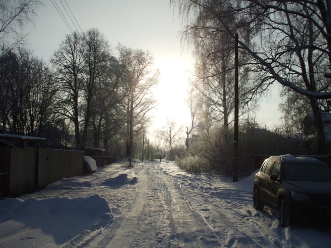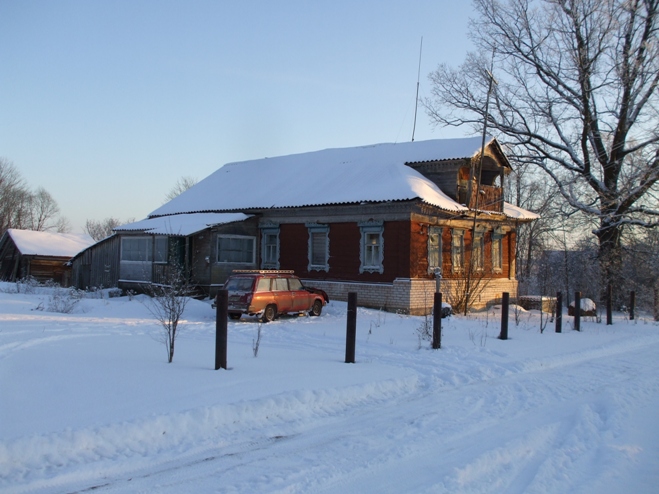 Die Autofahrt fing keine zwei Minuten nach Abfahrt schon problematisch an: Eine Frau überquerte die Straße, ohne dass sie Mashas Vater beachtete, der wiederum kam mit dem Auto ins Rutschen und hätte die Frau fast umgefahren. Nach einem kurzen Stopp an einer Tankstelle ging die Fahrt "zügig" weiter und es dauerte nicht lange, da wurden wir an den Straßenrand gewunken - weil wir zu schnell unterwegs waren. Nach dem zweiten Zwischenfall mussten wir auf der Schnellstraße in der Nähe Taraßovkaja stark abbremsen und kurz danach spürten wir einen kurzen Ruck an dem Auto. Eine mit dem Handy telefonierende Frau ist uns hinten drauf gefahren und zunächst machte es den Eindruck, als hätten wir gewonnen. Bei ihr hing das Nummernschild schief, bei uns war nichts zu sehen. Nach einem kurzen Gespräch mit ihr ging es weiter. Und nach einem guten Stück weiter geschah so etwas wie das achte Weltwunder. Ein Zivilwagen überholte uns hupend, darin saß winkend ein Milizionär, der uns anhalten wollte. Nach einer kurzen Unterhaltung stieg er unseren Wagen ein und er lotste uns auf die Gegenrichtung der Autobahn bis zur nächsten Polizeistation. Zwischendurch wurden wir gewahr, was jetzt wieder los war: Die Frau behauptete, dass wir ihr hinten draufgebrummt wären. Eigenartig nur, dass ihr dann vorne das Nummernschild schief hängt... Als der Vater aus der Polizeistation heraus kam, erzählte er, dass es dort wohl arg nach Wodka gerochen haben soll. Nun ging es weiter ohne Zwischenfälle ins Dorf. Die letzten zehn Kilometer waren etwas beschwerlicher, weil die Sandpiste gefroren und mit Schnee bedeckt war. Und je näher wir dem Dorf kamen, umso schlechter wurde der Weg. Auf den letzten paar Kilometern haben wir drei Fahrzeuge gesehen, die verlassen und steckengeblieben waren. Und auch Mashas Vater ist mehrfach ausgestiegen, um den besten Weg zu finden. Im Dorf angekommen habe ich wieder einmal gestaunt, dass ein Volkswagen eine solche Fahrt aushält.