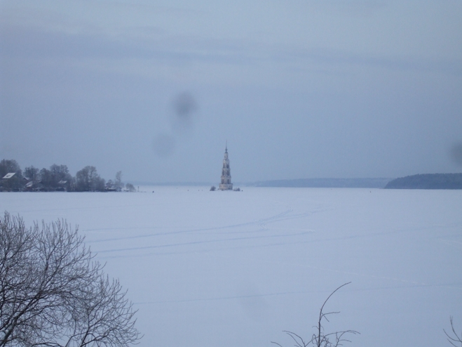Am nächsten Morgen haben wir in aller Ruhe das Haus abgerüstet und später haben Masha und ich noch einmal bei etwa -20°C noch einen Spaziergang zur Wolga gemacht. Die Abfahrt erfolgte um etwa 13:30, doch kurz nach dem Dorf schon das erste Problem: Der Wagen hatte sich festgefahren und die Räder drehten nur noch durch. Doch das Problem wurde schnell gelöst: Ein paar Stöckchen und Äste unter die Räder, leicht Gas geben und schon war das Auto frei. Wir haben noch eine kleine Pause bei Vater Leonid im Dorf Krassnoje Selo eingelegt und uns die Kirche, die sehr dörflich wirkte, angeschaut. Und ich hatte die Gelegenheit ein typisch russisches Pfarrhaus zu schauen, wo er mit seiner Frau wohnt. Ein weiterer Halt war der Kirchenturm von Kaljasin, der nach einem Staudammbau in der Wolga von einem Kloster übrig geblieben ist. Auf der Rückfahrt wurden wir wieder von den russischen Behörden angehalten und so ging die Fahrt in "zügigem" Tempo nach Sergijev Possad, wo wir noch kurz ins Kloster geschaut haben. Am späten Abend waren wir dann hundemüde wieder in Moskau!