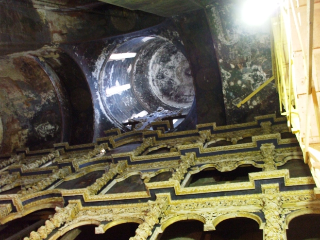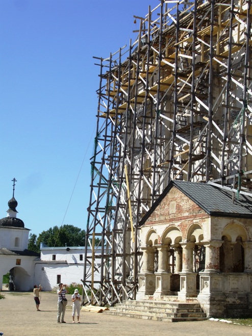 Auf dem gleichen Platz befindet sich auch die Maria-Entschlafungs-Kathedrale, die aber im Inneren noch einen trostlosen Zustand bietet. Einerseits sind die Spuren der Sowjetzeit noch lange nicht an ihr vorübergegangen, andererseits steht sie etwas ungünstig, so dass es in ihr immer feucht ist, was der Bausubstanz geschadet hat. Aber man versuch langsam, sie zu renovieren. Daher ist sie auch ganz eingerüstet: Allerdings in ein Holzgerüst, dass ohne jeglichen Einsatz von Maschinen errichtet wurde. Selbst die einzelnen Latten wurden per Hand mit einem Seil nach oben gezogen.