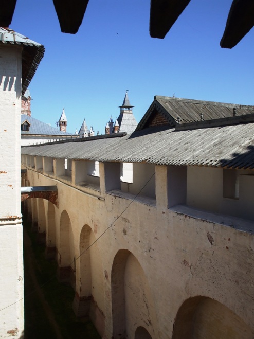 Es folgte ein Rundgang über die Kremlmauer, von der man ebenfalls wunderschöne Blicke in den Kreml und teilweise auch auf den See genießen kann. Die Dächer sind hier alle aus Holz. Faszinierend an einigen Stellen auch die vielen kleinen Türmchen, die den Kreml so verträumt erscheinen lassen.