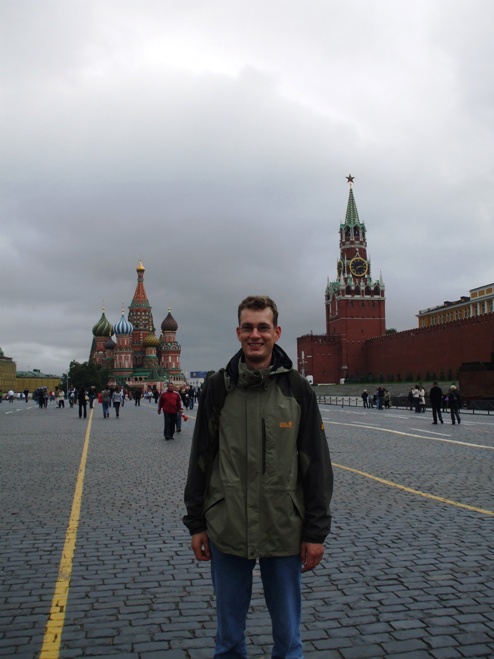 Nach einer etwas unruhigen Nacht habe ich zunächst meinen Eltern die ersten Eindrücke und vor allem die Ereignisse des letzten Tages erzählt, bevor ich mich dann mit Professor Sudov getroffen habe, der mir dann erst das Wohnheim gezeigt hat. Anschließend haben wir noch gemütlich bei einer Tasse Tee beisammen gesessen. Dann ging es auch schon los mit der Elektritschka - so etwas wie eine S-Bahn - und der Metro in die Stadt zu seinem Büro, wo dann die ersten wichtigen Dinge wie die Registrierung erledigt wurden, anschließend hat er mit mir zusammen eine SimCard gekauft und mir den Roten Platz gezeigt. Als ich dort war, merkte ich das erste Mal, dass ich in Moskau angekommen bin. Das sind dort schon sehr eindrucksvolle Gebäude, vor allem die Basiliuskathedrale mit ihren bunten Türmen. Leider war das Wetter nicht so gut, so dass ich noch keine tollen Fotos machen konnte, doch eines soll nicht vorenthalten werden: