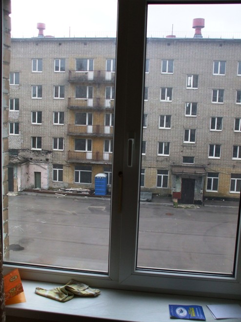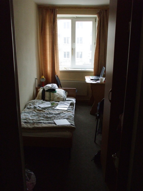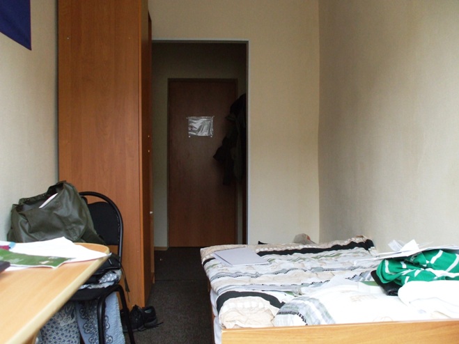 Wer vor dem Wohnkomplex auf der Ilovaijskaja Ulitza steht, der steht zunächst vor einer recht hohen Mauer, auf die zudem ein Metallzaun gebaut ist. Das rostrote Einfahrtstor hat ungefähr die selbe Höhe. Links daneben befindet sich eine Metalltüre, durch die derjenige ins Wohnheim gelangt, der dazu befugt ist. Dort sitzt in der Regel ein Wachmann, der die kleine Durchgehschranke überwacht und freigibt. Dann öffnet man eine zweite Türe und schon steht man linkerhand auf dem großen Hof. Wer durch die erste Türe geht, der kommt an einer Art Empfangsdame vorbei und ist sogleich im Wohnkomplex der Mädchen und Frauen gelandet. Die Jungs und Männer haben einen etwas längeren Weg vor sich, ihr Hauseingang befindet sich am anderen Ende das Gebäudes. Nachdem man durch die Türe gegangen ist, steht man schon im Treppenhaus. Die Stufen sind zwar alle recht klein, dafür aber unterschiedlich hoch und mal mit oder mal ohne Neigung (also schief und krumm). Man geht in die dritte Etage und dort finden sich rechter Hand Waschgelegenheiten und Toiletten und wenn man den Flur betritt, gelangt man rechts zur Küche und links zu meinem Zimmer mit der Nummer 328.