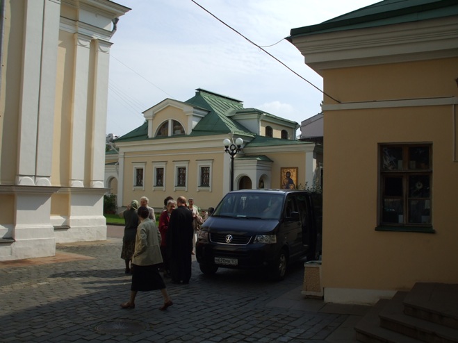 Da meine Batterie im Fotoapparat langsam den Geist aufgeben wollte, sind wir kurz in die Stadt gegangen, um neue zu kaufen und um gleichzeitig Eis zu essen, dass es ja Gott sei Dank in Russland günstig gibt. Anschließend sind wir in die Vesper gegangen in einer der großen Kirchen, die aber sehr voll war. Danach waren wir noch beim Ende der Göttlichen Liturgie, bei dem Erzbischof Evgenij Werejskij, der Rektor des dortigen Seminars, Hauptzelebrant war. Leider haben wir davon nicht mehr viel mitbekommen, eigentlich nur noch den Schluss und den Segen.