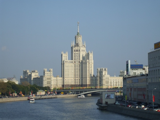 Der Diktator Stalin ließ in Moskau neben den prunkvollen U-Bahn-Stationen auch einige Hochhäuser bauen, die alle einen ähnlichen Baustil haben. Hier ist eines davon, dass gut sichtbar von der Brücke ist, die direkt auf die Basiliuskathedrale zuführt.