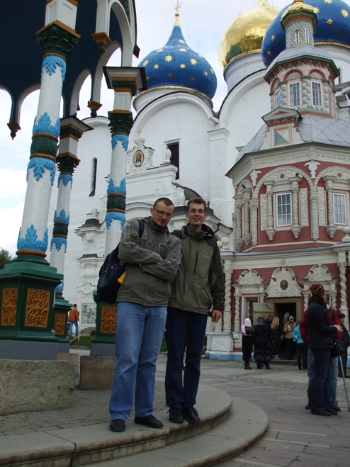 Was sich am Freitag schon leise angekündigt hat, wurde an diesem Tage besser! Die Rede ist vom Wetter. Als ich an diesem Morgen die Vorhänge an die Seite gezogen habe, lächelte die Sonne direkt in mein Gesicht! Also nichts wie zur Uni - zur einzigen Vorlesung an diesem Tage. Nachdem die vorbei war - es konnte mir heute nicht schnell genug gehen - habe ich schnell noch wie jeden Tag in der Stalovaja gegessen. Und dann konnte der Hauptteil des Tages beginnen: Ich war zu 13 Uhr mit Stephan in der U-Bahn-Station Komßomolskaja verabredet; wir hatten geplant, nach Sergijew Possad in das weltberühmte Kloster zu fahren. Da ich schon sehr pünktlich dort war, konnte ich mich noch ein wenig in der U-Bahn-Station umsehen und habe sie ein wenig portraitiert. Doch dazu mehr am morgigen Tag. Stephan und ich haben uns dann Fahrkarten gekauft, einen Zug knapp verpasst, dann aber den nächsten 20 Minuten später genommen. So konnte mein erster Ausflug ca. 70km vor die Tore Moskaus beginnen. Die Fahrt dorthin dauerte etwa 90 Minuten. Einerseits war die Fahrt die reinste Verkaufsveranstaltung - einer Kaffeefahrt für ältere Menschen ähnlich. Es vergingen die ganze Fahrt durchweg keine fünf Minuten, in denen nicht irgendeiner seine Waren feilgeboten hat. Auch dieses Mal konnte man Malsets, Eis, Magazine und noch vieles mehr kaufen. Die Krönung war jedoch ein Mann mit seinem Akkordeon und seiner Tochter, die ein Musikstück zum Besten gaben. Einige Leute haben den beiden schon bevor sie durch den Zug gegangen sind, etwas Geld oder sogar zu Essen gegeben, wohl damit sie schneller aufhören, denn Musik und Gesang waren wirklich nicht von Qualität. Die Fahrt verging sehr schnell mit russisch und deutsch sprechen (üben) und aus dem Fenster schauen. Die Landschaft, die vorbeizog, war für mich schon die reinste Erholung, da ich endlich wieder ein paar Wiesen, Wälder und sachte Hügel sehen konnte! Keine Großstadt mit Lärm, Gestank und Krach!