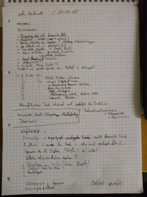 Glanzparade!! Heute habe ich das erste Mal richtig viel in der Vorlesung zum orthodoxen Kirchenrecht verstanden und sogar mehr als eine Seite mitschreiben können. Damit habe ich mehrere Russen geschlagen! Da bin ich richtig stolz drauf und habe es vielen hier gleich voll Freude erzählen müssen! Ich hatte zwar einen Nachbarn an der Seite, der mir selten mal zur Hand gegangen ist, aber heute habe ich außer dem Oberthema auch viel vom Inhalt verstanden!