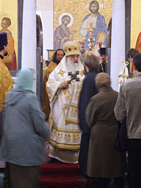 Nun aber zu eigentlichen Tag, an dem in der Russisch-Orthodoxen Kirche das Fest des Hl. Tichon gefeiert wird. Er ist der Namenspatron der Universität (Orthodox-humanistische Heiliger-Tichon-Universität). Dazu war heute der Patriarch der Weißrussisch-Orthodoxen Kirche Philaret angekündigt, der gleichzeitig Metropolit der Russisch-Orthodoxen Kirche ist. Dazu nun eine Erklärung, die gar nicht so einfach ist: Zunächst ist die Weißrussisch-Orthodoxe Kirche Exarchat der Russisch-Orthodoxen Kirche, ihr also unterstellt. Kirchenoberhaupt der Weißrussisch-Orthodoxen Kirche ist Philaret, der aber dem Moskauer Patriarchat (also der Russisch-Orthodoxen Kirche und damit Patriarch Alexej II) unterstellt ist. Die Weißrussisch-Orthodoxe Kirche geht auf das Jahr 1595 zurück, als sich Teile der Orthodoxen Kirche dem Papst unterstellten und damit die Orthodoxie spalteten. Im 19. Jahrhundert gab es vielfach Bestrebungen, die mit Rom unierten Christen in die Orthodoxe Kirche zurück zu holen. Dies führte wiederum zu einer Kirchenspaltung: Der eine Teil blieb katholisch und der andere Teil wurde wieder orthodox. Während der Sowjetzeit wurde die Union politisch (also unter Zwang) aufgehoben. Daraus wurde nach Perestroika und Glasnost die Weißrussisch-Orthodoxe Kirche gegründet (Nun hoffe ich, dass das hier alles richtig ist, es ist lediglich aus dem Gedächtnis geschrieben).