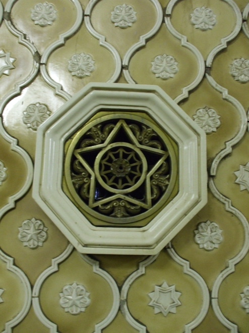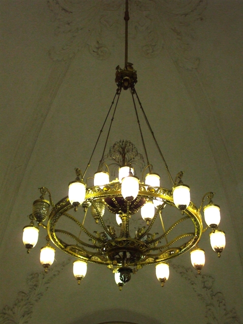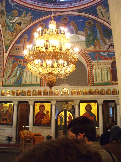 Weil ich auch sonst nur sehr wenig oder gar nicht in Kirchen fotografieren werde: Hier ein Blick auf die Ikonostase: In der Mitte sind die Königstüren, rechts und links daneben die Diakontüren (die rechte ist ein wenig geöffnet). Hinter den Königstüren kann man ein großes Christusmosaik im Altarraum erkennen. Links die Marienikone und rechts die Christusikone. Knapp über dem Kronleuchter ist die Heilige Dreifaltigkeit abgebildet, auf deren Namen die Kirche geweiht ist. Auf den Türen sind jeweils Erzengel-Ikonen.